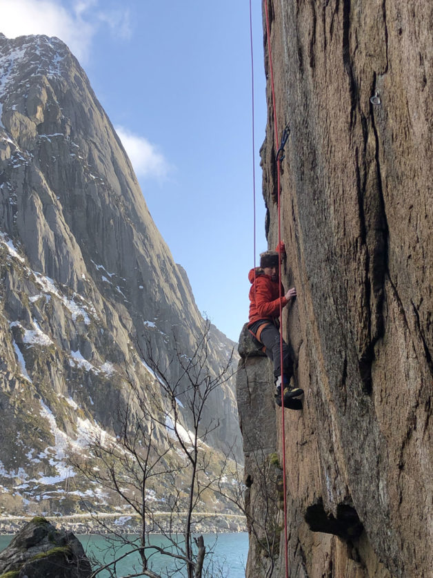 När jag klättrar på Lofoten så känner jag havet inkapslat av min hud, de oändliga vågorna av rädsla i symbios med rörelsekraft – min intuition i dialog med kroppen.