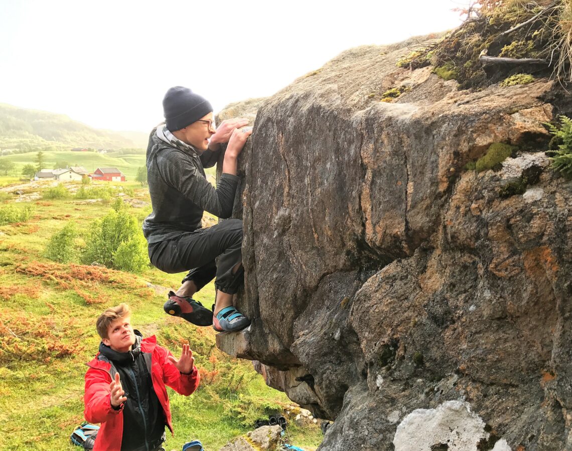 Vädret i Bodö är minst sagt växlande och nederbörd är inte ovanligt. Genom midnattssolen var det möjligt att kvällsklättra de dagar det var bra väder och kroppen tillät det. De lite mer överhängande området Bratthammaren hade även flera leder som höll sig torra även vid regn. Kvällsbouldring Mjellestrand. Foto: Jessica LeanderBratthammaren. Foto: Jessica Leander